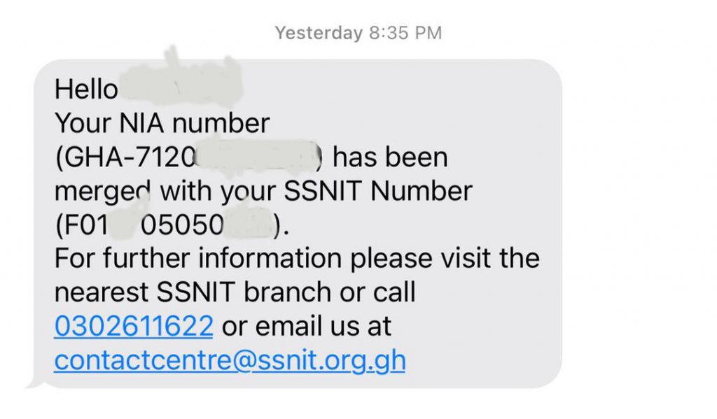 The Social Security and National Insurance Trust (SSNIT) has deployed systems that allow members of the scheme to merge their SSNIT and NIA numbers (Personal ID Numbers on their Ghana Cards).