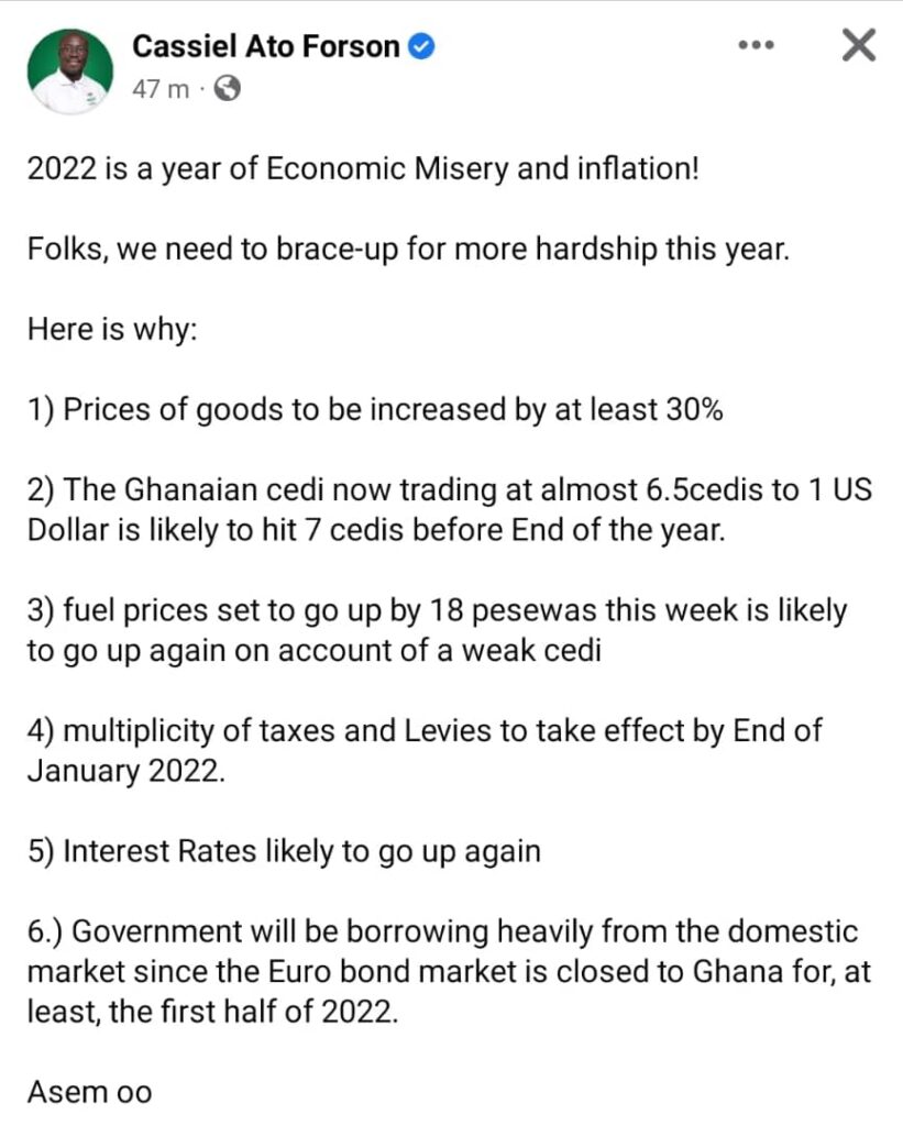 In a six-bullet point post on Facebook, Dr. Forson, who is also the Member of Parliament for the Ajumako-Enyan-Esiam constituency, among other things, said: “folks, we need to brace up for more hardship this year”.