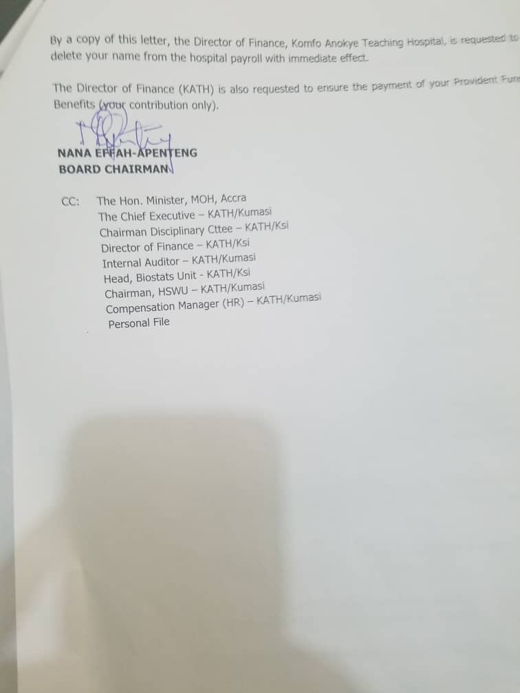 A letter dated December 20, 2021 (copy attached below), signed by the board chairman, Nana Effah-Ampenteng, directed the hospital’s director of finance to pay him all his entitlements.